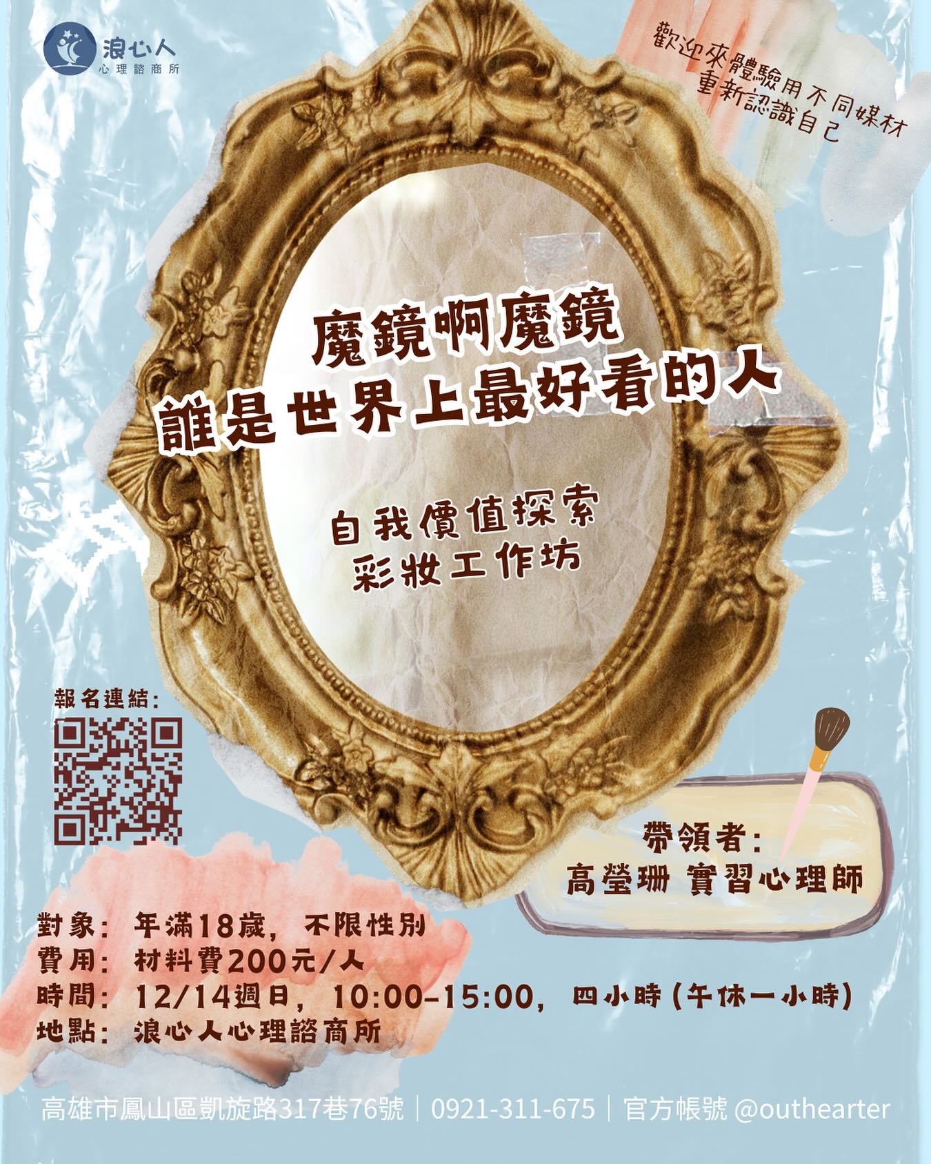 我是誰?我應該成為誰?我不知道怎麼喜歡自己…如果你也是看著五彩繽紛形形色色的世界,找不到自己的定位與價值,或是覺得想用更有趣的方法自我探索,歡迎來參加「魔鏡啊魔鏡-自我探索彩妝工作坊」,心理師將透過彩妝與牌卡結合體驗,帶你重新看見自己,找到屬於自己的精彩~